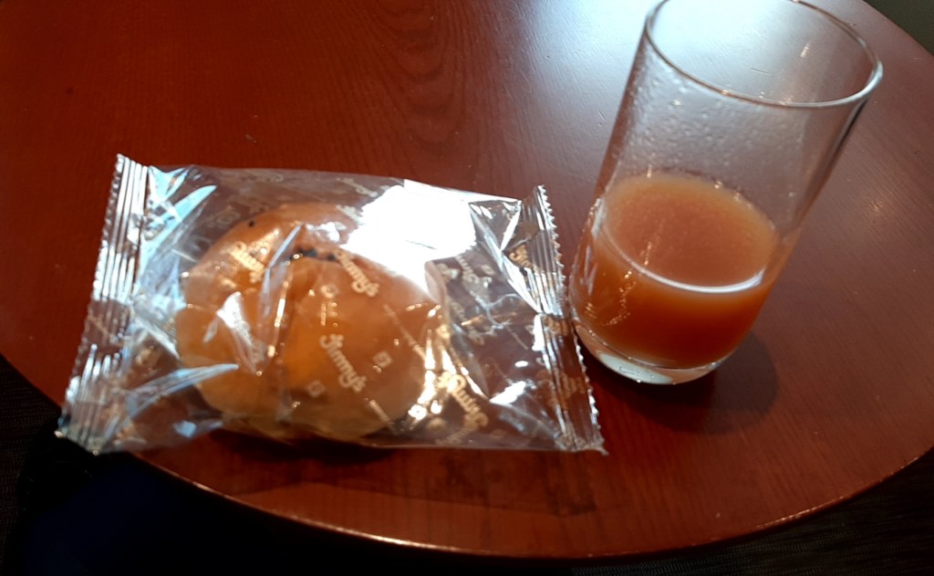ラウンジの中に入ってみると、2人席をひとりで使用しているところも多々あります。トラさんが案内されたのも対面の2人席でした。仕方がないのですが、柔軟に対応できないものでしょうか。トラさんはグアバジュースと紅芋あんパンだけ頂き、10分程度だけで退室しました。