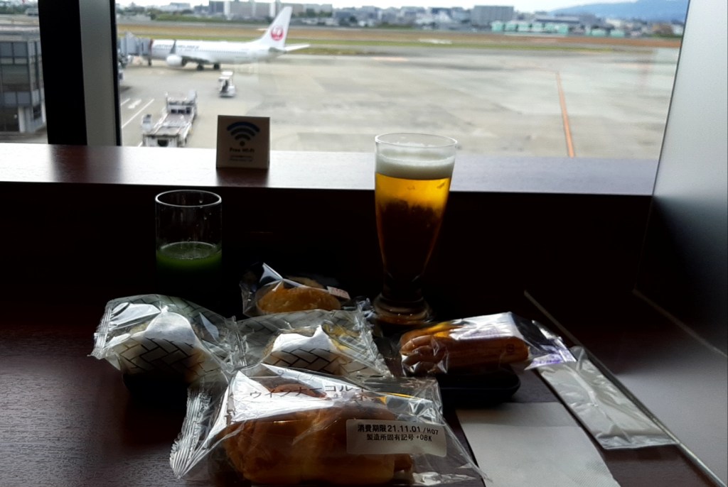 伊丹空港のファーストクラスラウンジは那覇ほど混んでいないので良い感じです。青汁がありました。