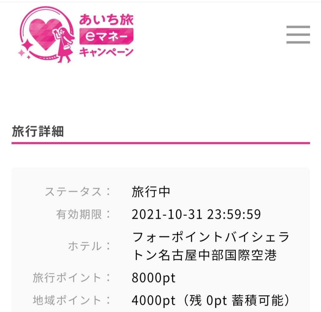 トラさんが出掛ける前にレセプションに寄り、昨日お部屋付けにしたテイクアウトと売店で購入したペプシの代金を「あいち旅eマネーキャンペーン」のQRコードによみこませます。合計で4,014円だったので、4,000円分の還元となります。この時点では地域ポイントとして反映されているかを確認します。