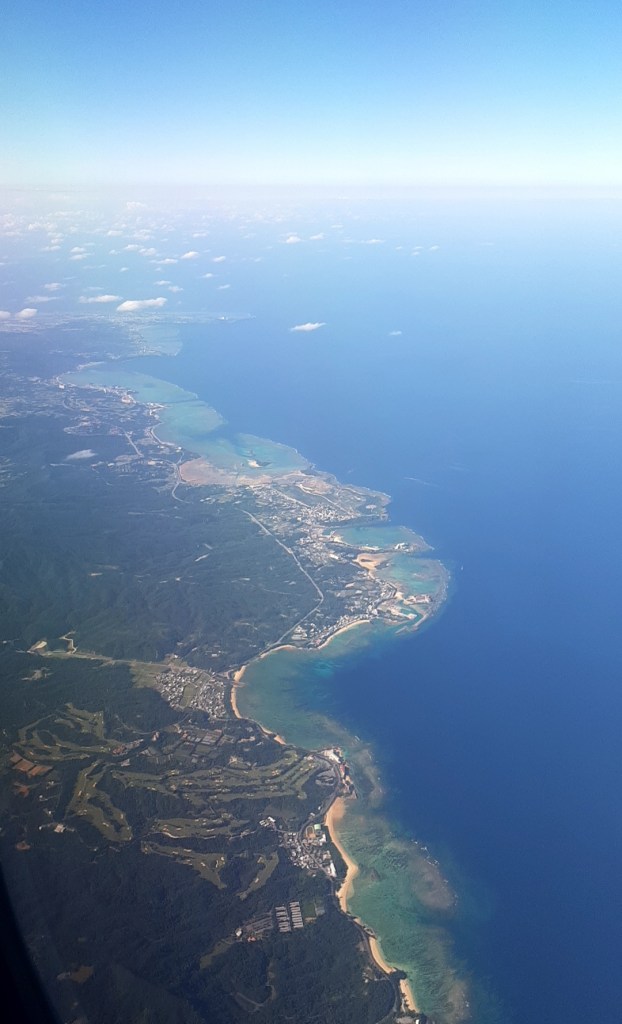 那覇行きのフライトはクラス J の3人掛けシートですが、お隣もその横もいません。結構ガラガラです。CAも余裕があるのか、外に見える島々の解説が入ります。