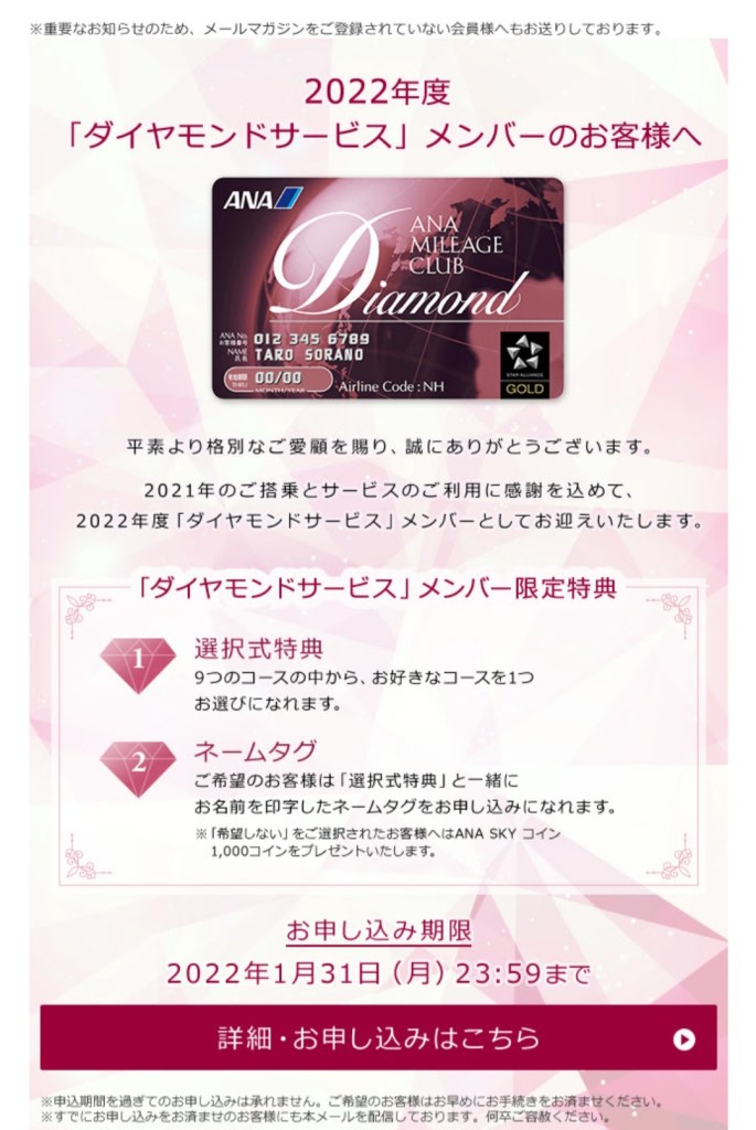 今日、ANAマイレージクラブよりメールを頂きました。2021年のフライト実績により、2022年度(4月以降)はダイヤモンドサービスメンバーとして迎え入れてくれるとの連絡です。
