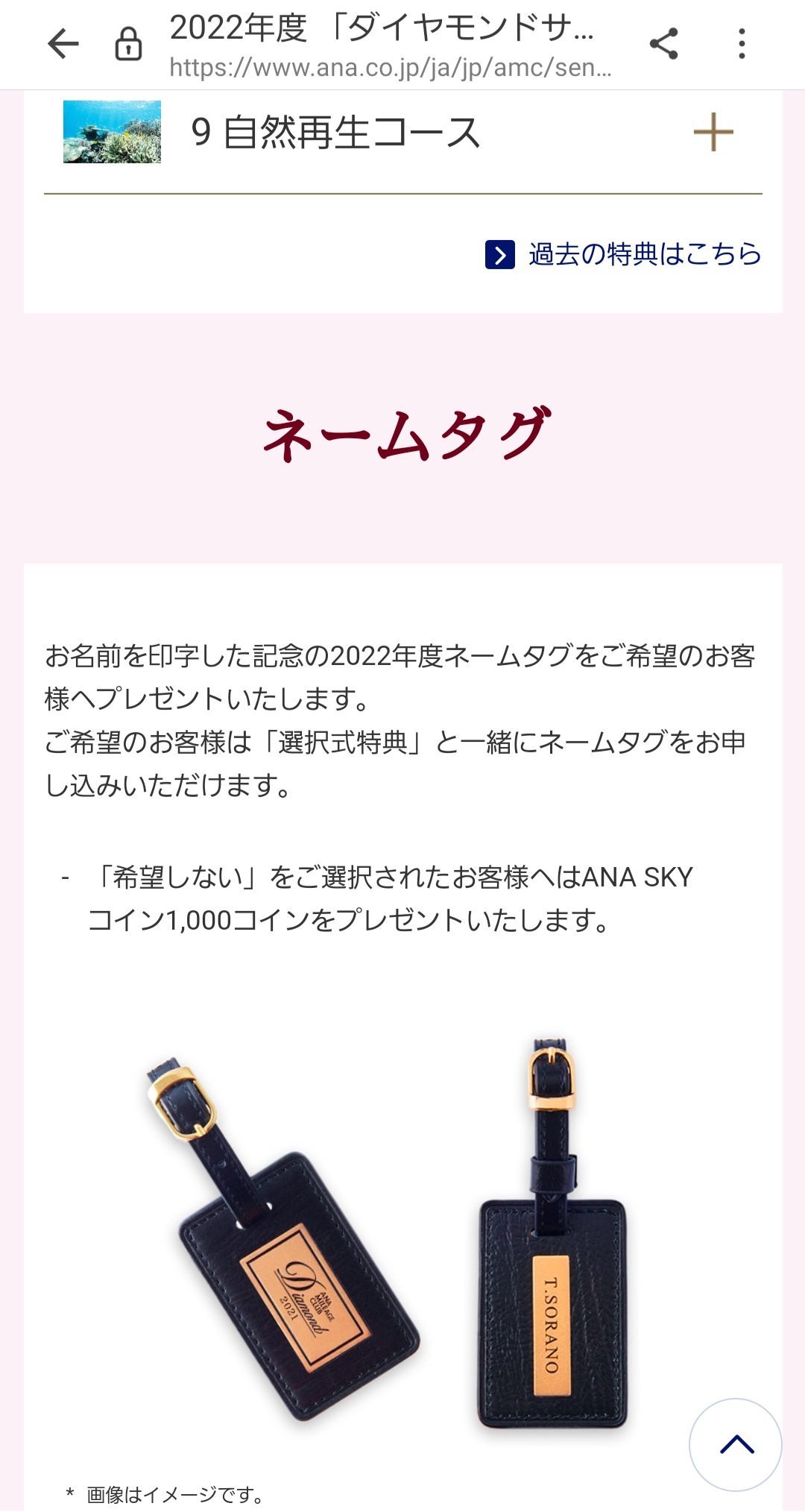 ANAは9つのコースから選ぶことになります。ネームタグは西暦とDiamond、裏には自分の名前も入ります。