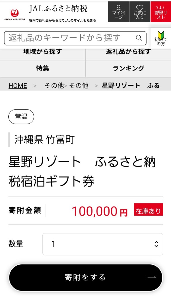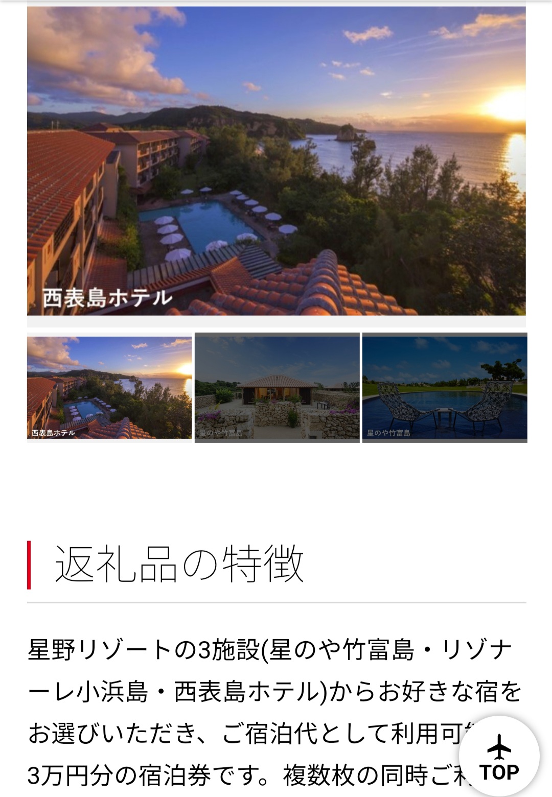 10万円分くらいをしようと考えており、沖縄県竹富町の返礼品に、星野リゾートの宿泊ギフト券が頂けるものにしました。