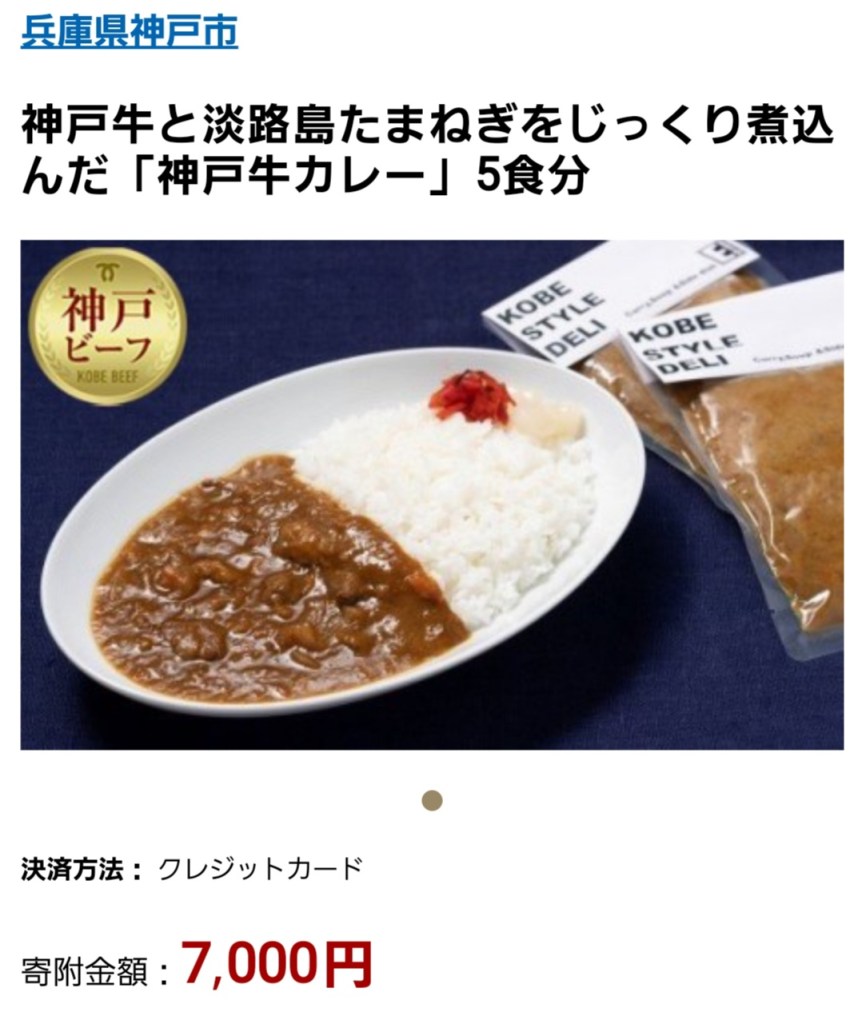 また、兵庫県神戸市にも寄付をし、お礼の品は「神戸牛と淡路島たまねぎをじっくり煮込んだ神戸牛カレー5食分」にしました。