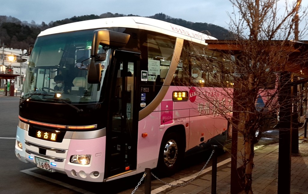 17:00に河口湖駅前から名古屋駅に向けて長距離バスで移動します。名古屋までは掛川PAで30分の休憩を含め4時間20分(運賃4,500円)かかります。