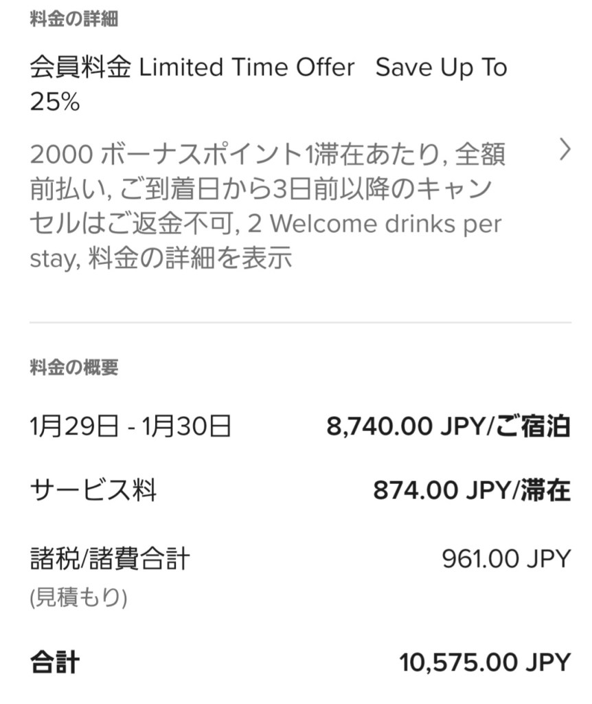1ポイント1円の価値と考えると、10,575-3,852=6,723円で宿泊できたことになり、非常にお得感があります。