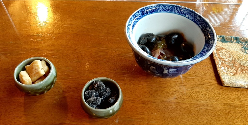 最初にブラックオリーブのマリネ、黒豆の砂糖まぶし、柚子風味のおかき、がでて来ました。さらに、シャンパン、赤白ワイン、日本酒、ノンアルコール類から選択した飲み物が提供されます。