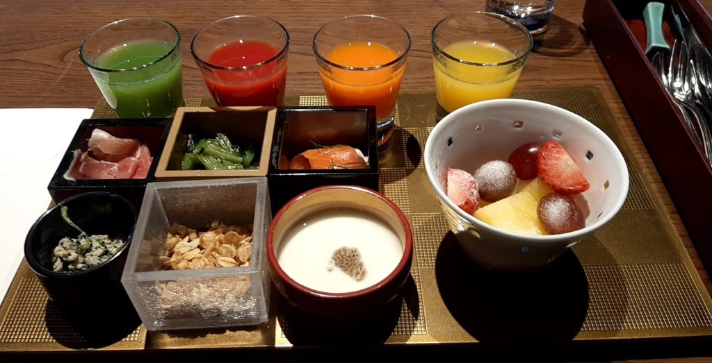 朝食は二人共、和定食を予約していました。最初にカラフルなフレッシュジュース4種類と、果物やチアシード入りのヨーグルト、生ハム、ナッツなどのオードブルが提供されました。