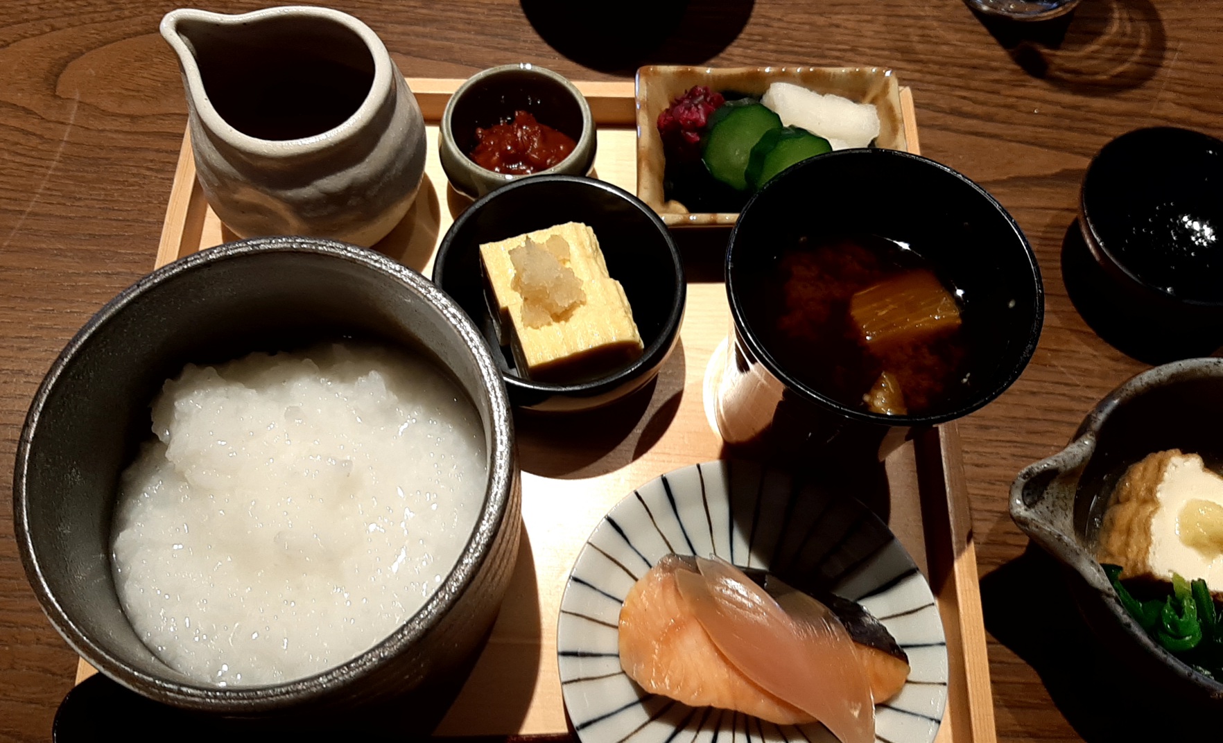 次にエビのビスクスープとカレーライスが少々出てきました。さらにお粥、味噌汁、鮭、出汁巻き、お漬け物等が出てきました。
