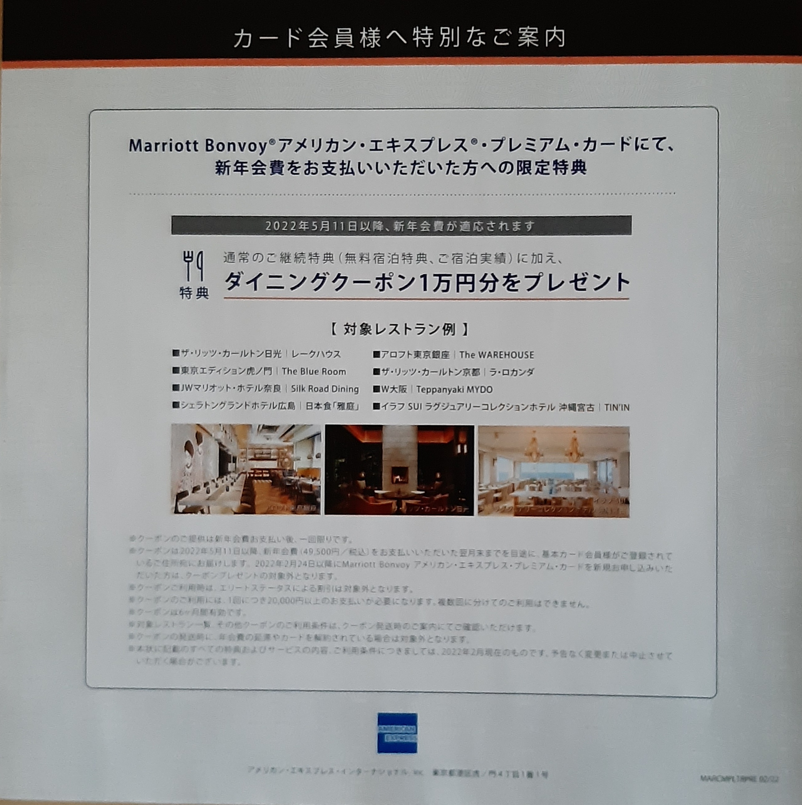 中身はAMEXらしいゴージャスなパンフレットです。大半がWEBページからでも得られる情報ですが、新年会費を支払うとダイニングクーポン1万円分がプレゼントされる詳細が記載された別紙が同封されていました。