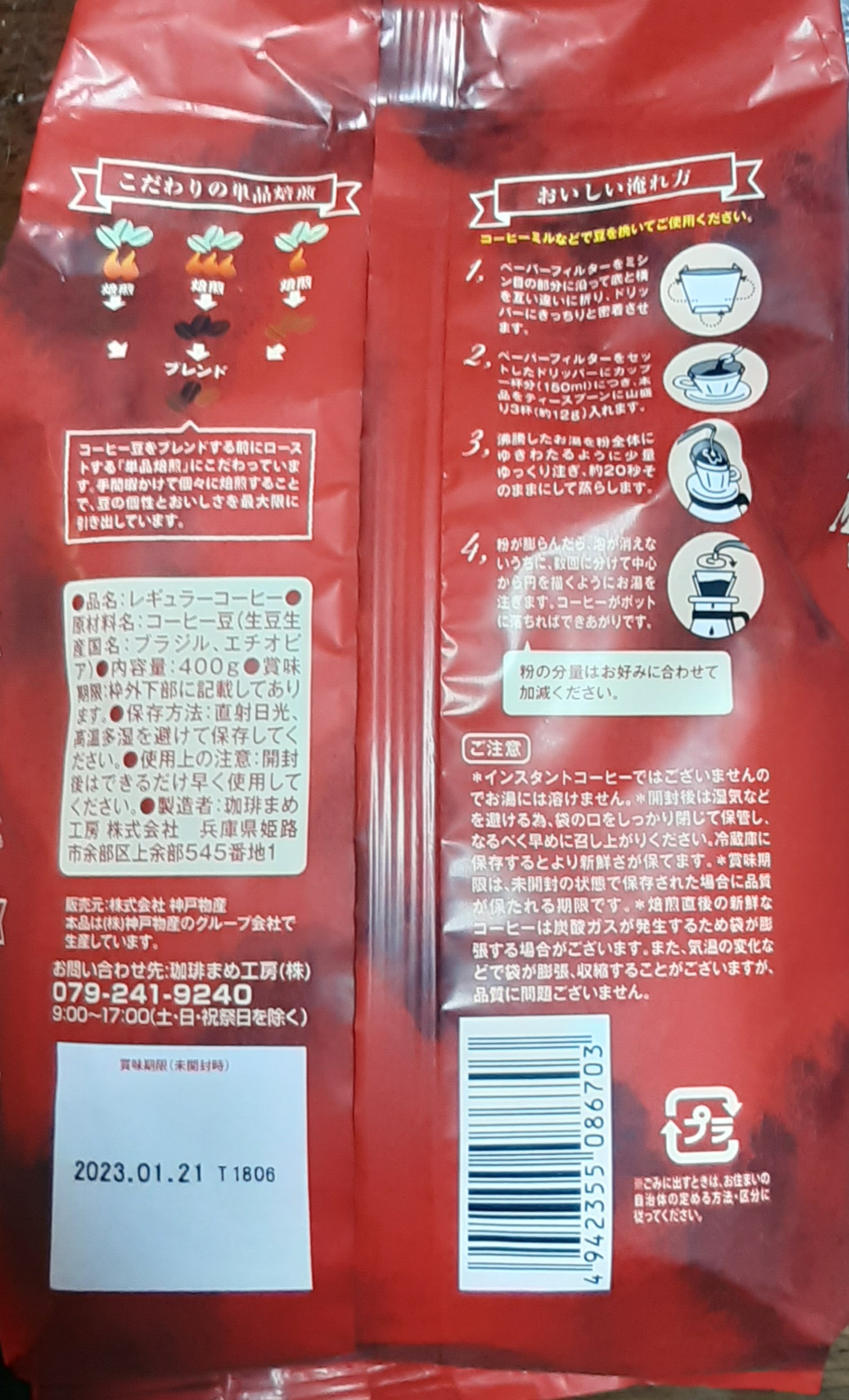 安くてトラさんが美味しいと思うのは業務スーパーで売っている赤い袋のコーヒー豆です。400gで430円です。白い袋もありますが、トラさんは赤い袋の方がスッキリしていて好きです。