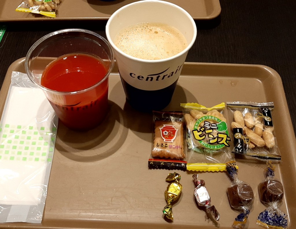 まん延防止措置が出ているためか、ラウンジでのアルコール提供はありませんでした。トラさんはトマトジュースとカフェラテを頂きました。トマトジュースがあまりにも美味しく感じたので、思わず唸ってしまいました。