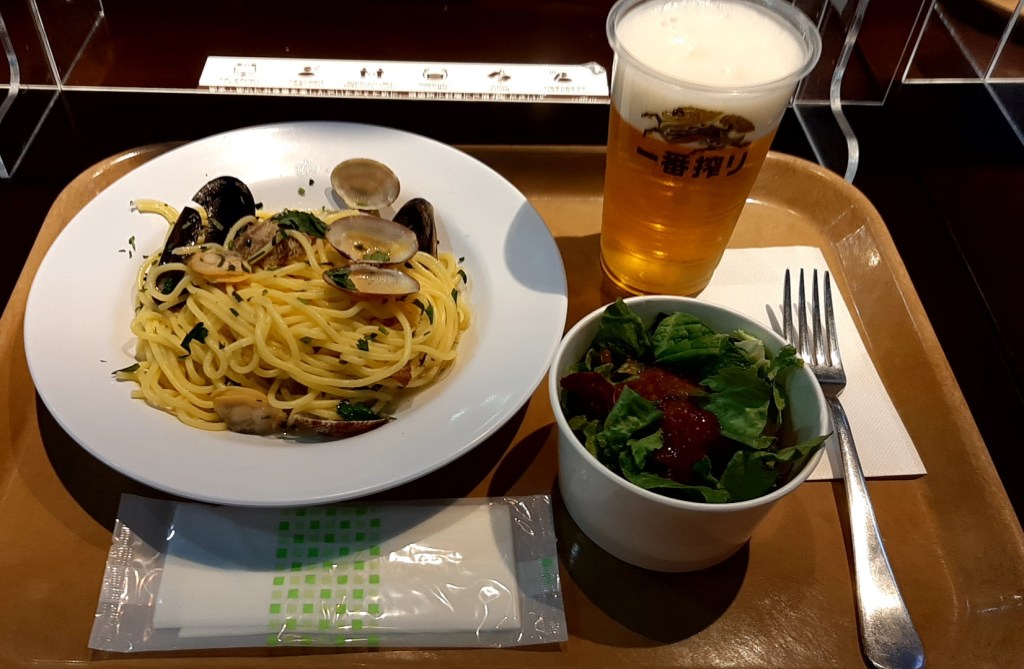 前回はピザを注文したら、あまりにも大きく食べきるのに苦労したので、今回はスパゲッティボンゴレにしました。ドリンクはやっぱり、まずはビール(KIRINの一番搾り)!ですね。