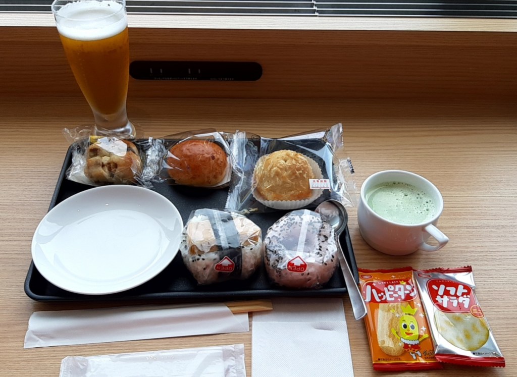 おにぎりやパンも一通りもらって来ました。シートは空港を見渡せる窓際席に