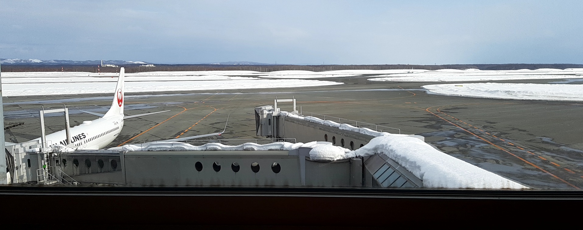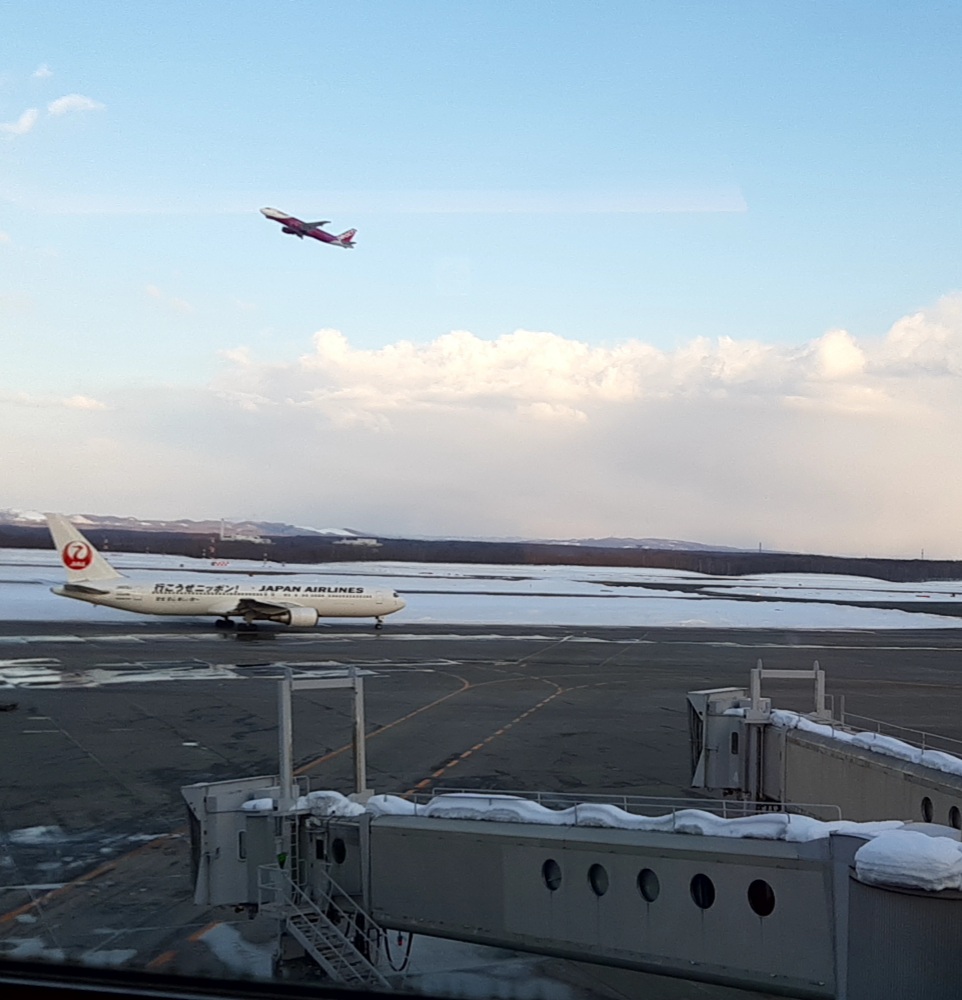 新千歳空港はほんの3日程前まで雪で機能停止状態でしたが、今日は晴れ間も見えていました。