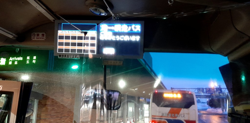 女満別空港へは17:25着予定でしたが、少し早めの17:17に到着したため、空港ビルを出てすぐの所に停まっていた網走バスターミナル行き17:30発のバスに余裕で乗れました。