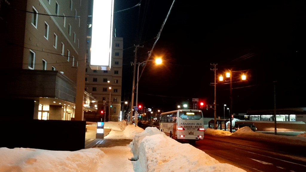 網走駅前で降車します。すき家があったりファミレスのビクトリアステーキがあったり意外に飲食店がありました。我々が泊まる東横INNは網走駅前にありました。