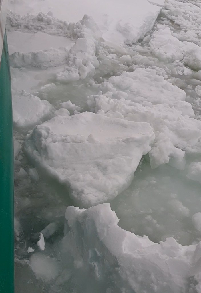 船のエンジン音と流氷がぶつかる音が重なり、迫力満点‼️です。トラさん達は最初一番上の3階から見ていましたが、2階へ移動し、さらに1階へも移動しました。