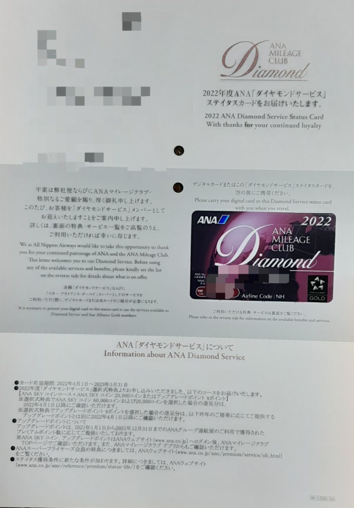 中を確認すると、2022 Diamond Status CARD が入っていました。