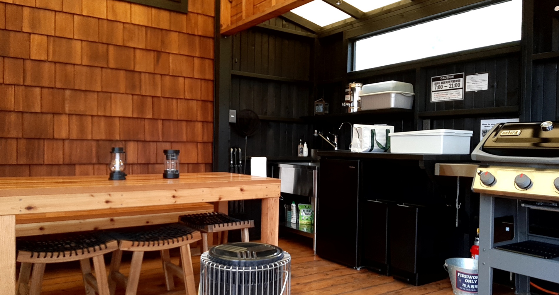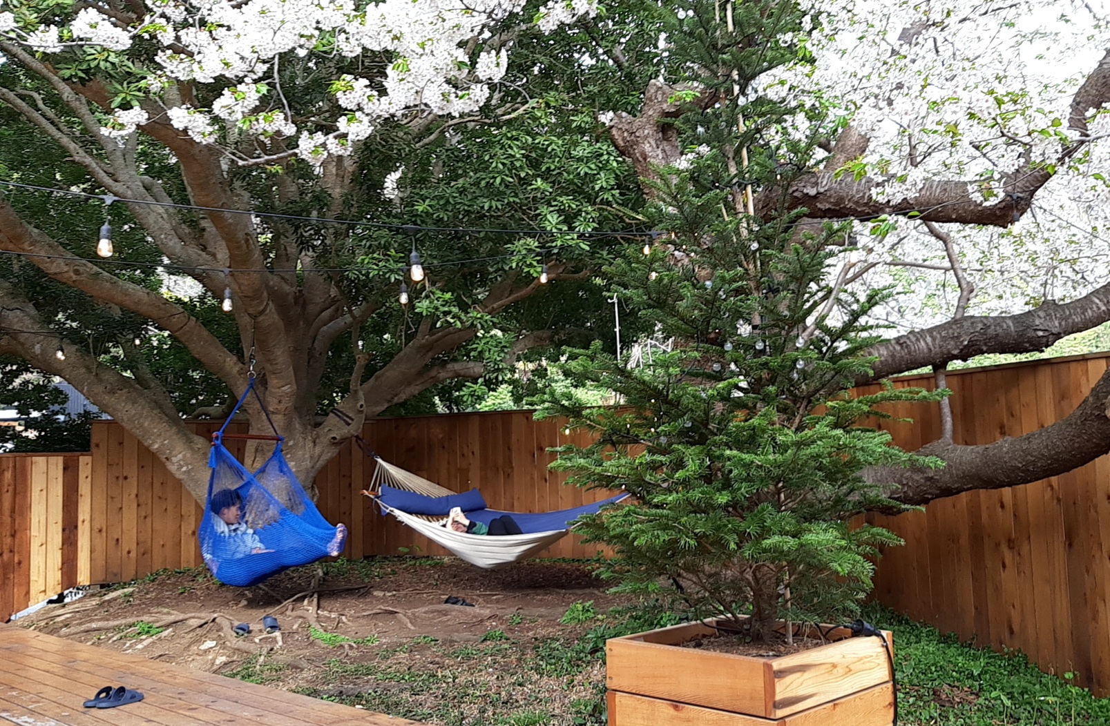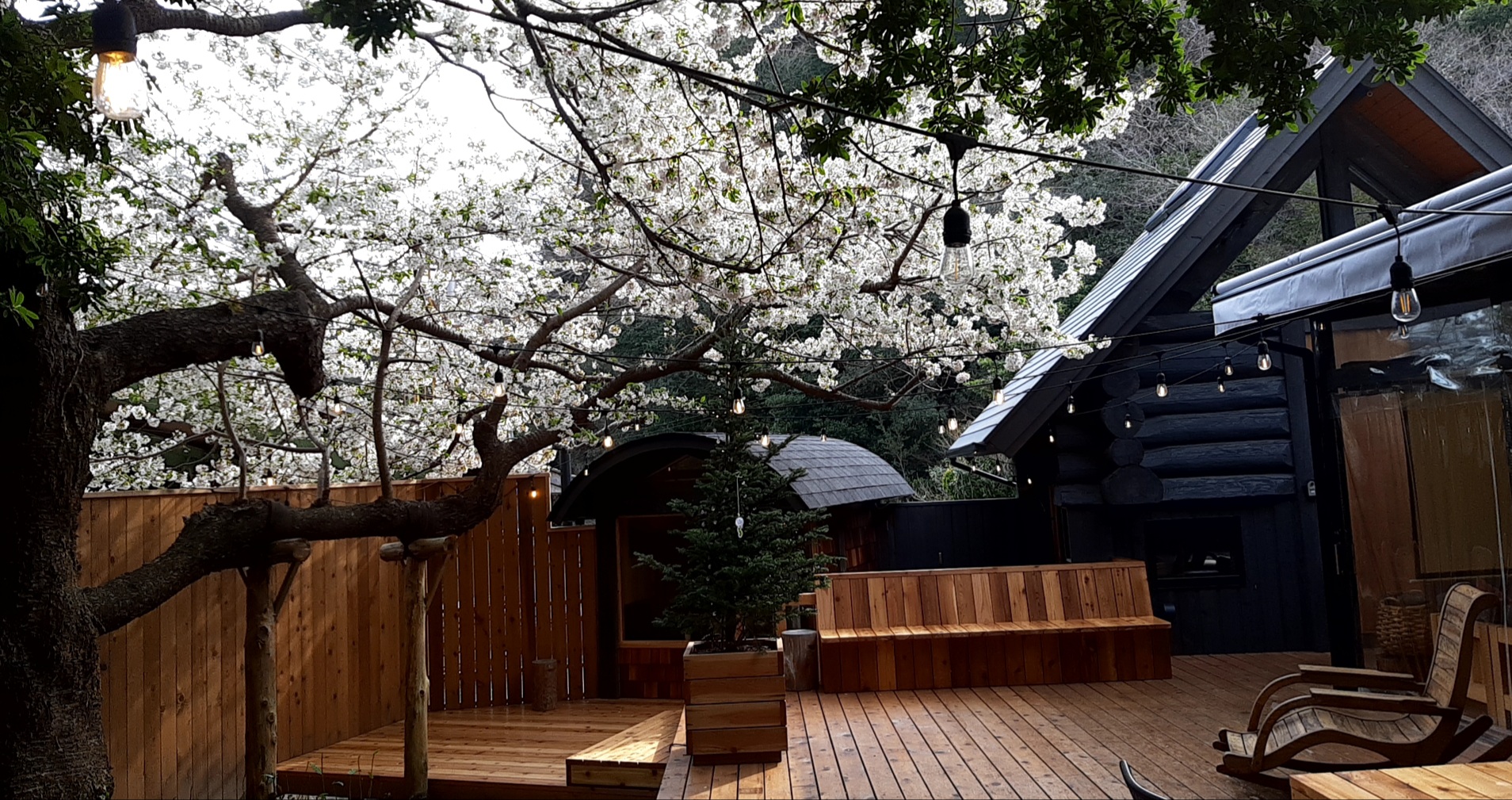 広々したウッドデッキに、満開の桜の木、そこに掛けるハンモック、檜の湯船のアウトバス、本格的なサウナ、バーベキューグリルのあるセミオープンデッキのキッチン、巨大スクリーンのあるセミオープンデッキのリビング…
