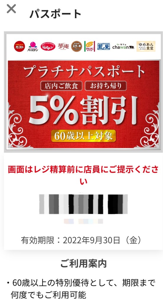 ガストでは60歳以上が使えるプラチナカードで5%引きになりました。地味にうれしものです。今はすかいらーくのアプリから提示できます。店員さんは年齢確認しませんでしたが、アプリで表示されるのは60歳以上だけなのでしょうかね。