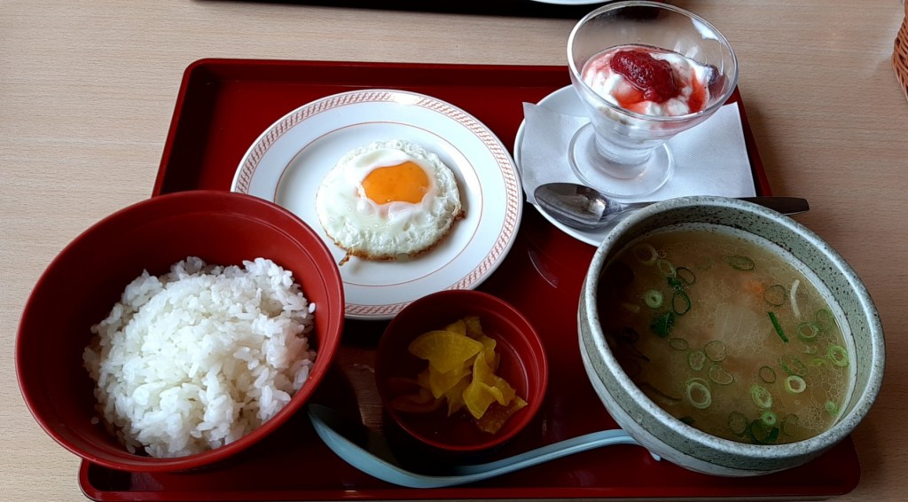 24日の朝食はファミレスの「Joyful」。トラさんは豚汁朝食ドリンクバー付(649円)、カウちゃんはモーニングエッグプレートスープ&ドリンクバー付(649円)を頂きました。