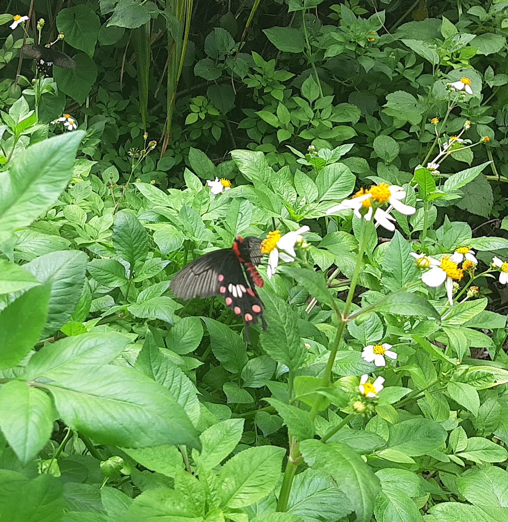 後で調べてわかりましたが、この蝶は「ベニモンアゲハ」といい、体内にアルカロイドという毒素を持っているそうです。鳥が食べても不味いから吐き出してしまうぐらいだとか。