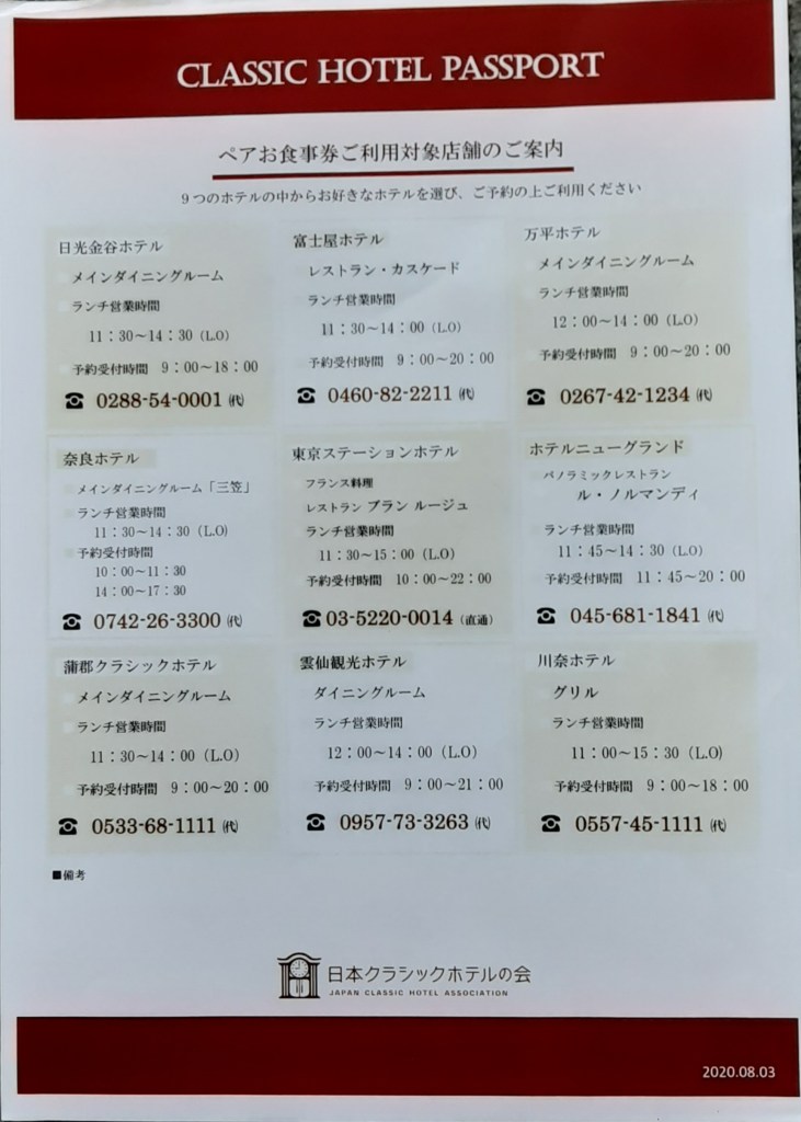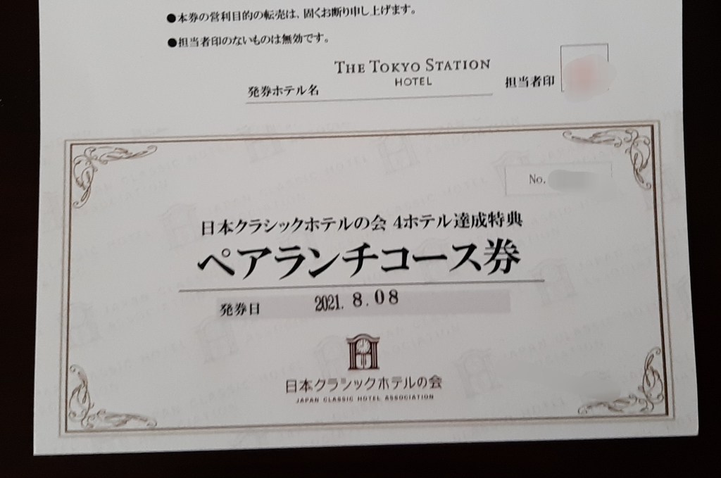 昨日ご紹介したクラシックホテルパスポートを購入し、4つスタンプを貯めるとペアランチ券を頂けます。