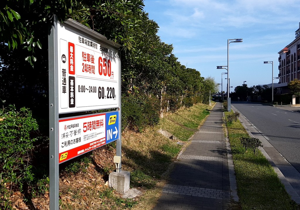 HRの駐車場に停めると1,600円/泊しますが、近くのコインパーキングで24時間最大650円というのがあり、そこにしました。もう少し離れた所に24時間最大440円というコインパーキングもありました。