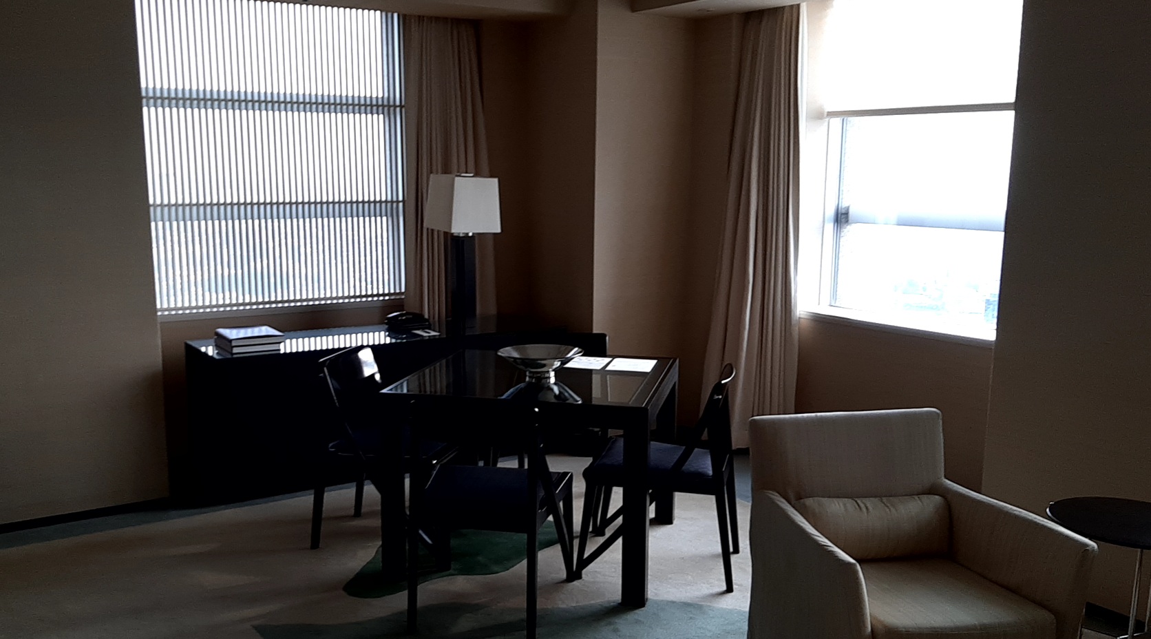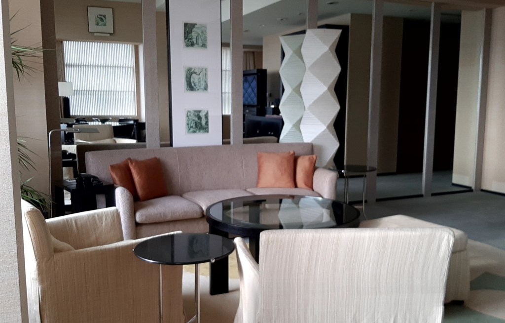 アサインされたお部屋は、43階のパークスイートでした。100㎡の広さがあり、入口を入るとリビングルーム、ベッドルーム、バスルームと続いているので、一周すると元の入口に戻って来れるようになっています。