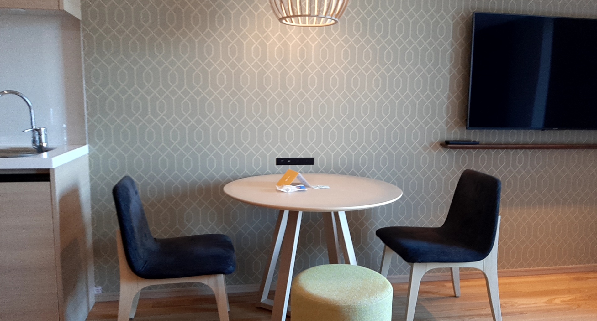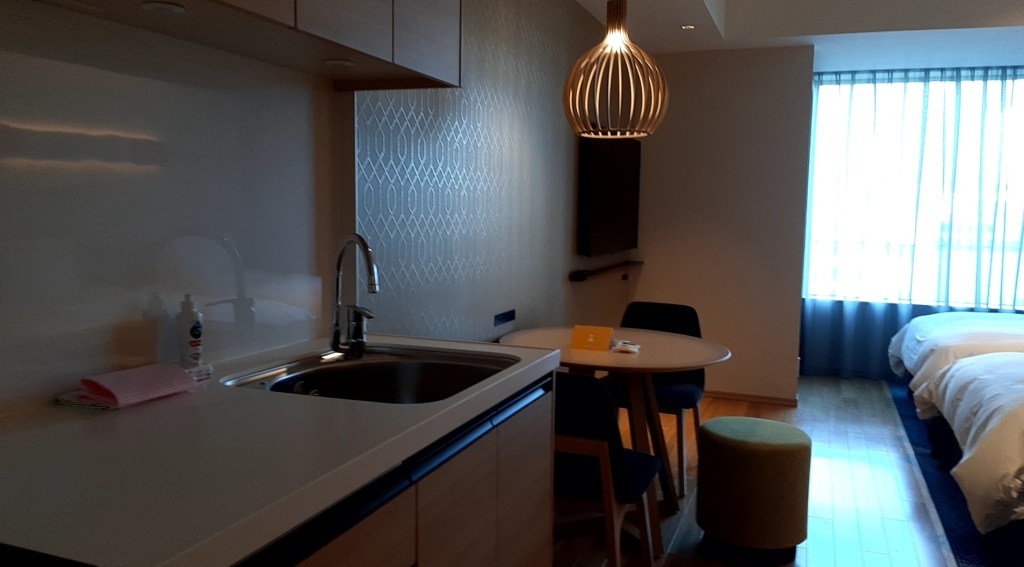 お部屋はシンプルで機能的、調理器具や食器類も一通り揃っており、さすが長期滞在向けのホテルです。