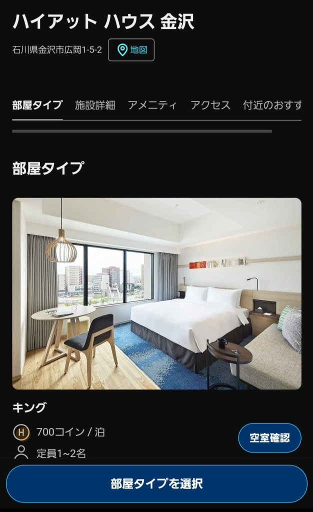 そういえば、このHYATT HOUSE 金沢はトラさんも会員になっている宿泊施設のサブスクモデルの「HafH」でも利用できます。1泊700コインから宿泊できるので、HYATTの宿泊実績を積む目的ではなければかなりお得に泊まることができます。