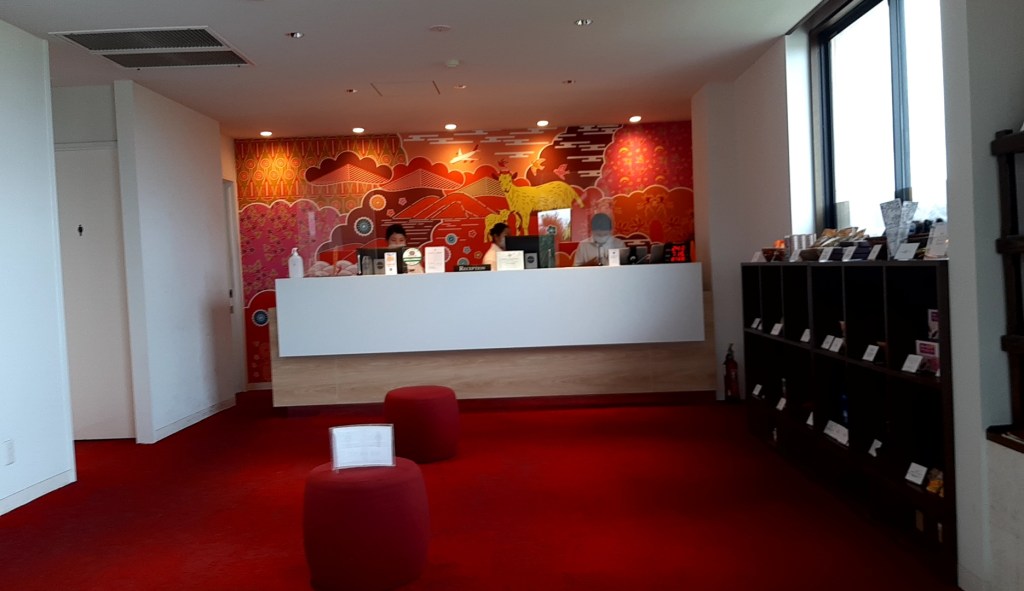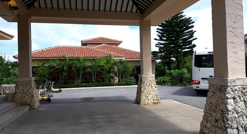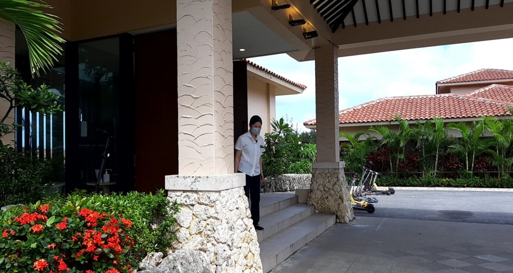 送迎バスでリゾナーレ小浜島のレセプションに到着しました。◯◯様、お待ちしておりました!と若い女性スタッフがバスから荷物をおろしてカートに積んでくれます。