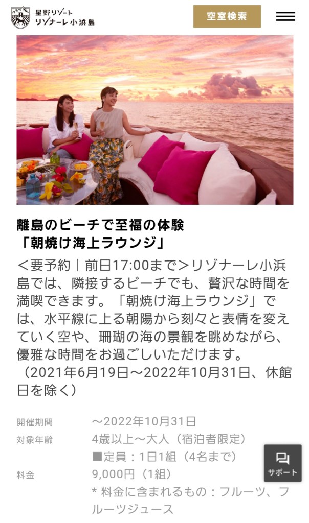 チェックインの時に翌朝のアクティビティとして「朝焼け海上ラウンジ」(9,000円/グループ)をリクエストしましたが、後から予約で一杯ですとの回答がきました。宿泊予約時にリクエストする必要がありそうです。