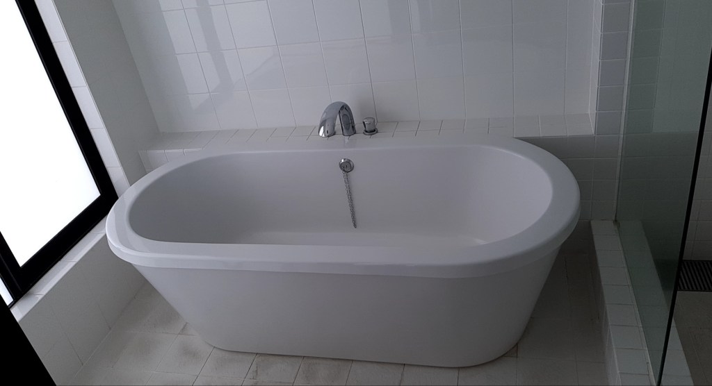 バスルームはシャワーブースと湯船が別になっており、湯船につかりながらラグーンの眺望を楽しむことができます。