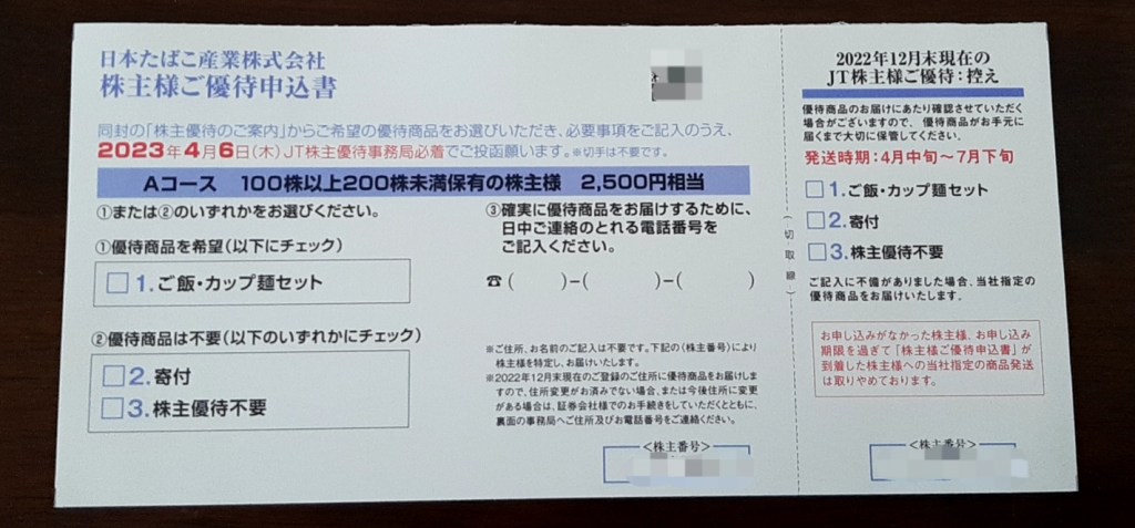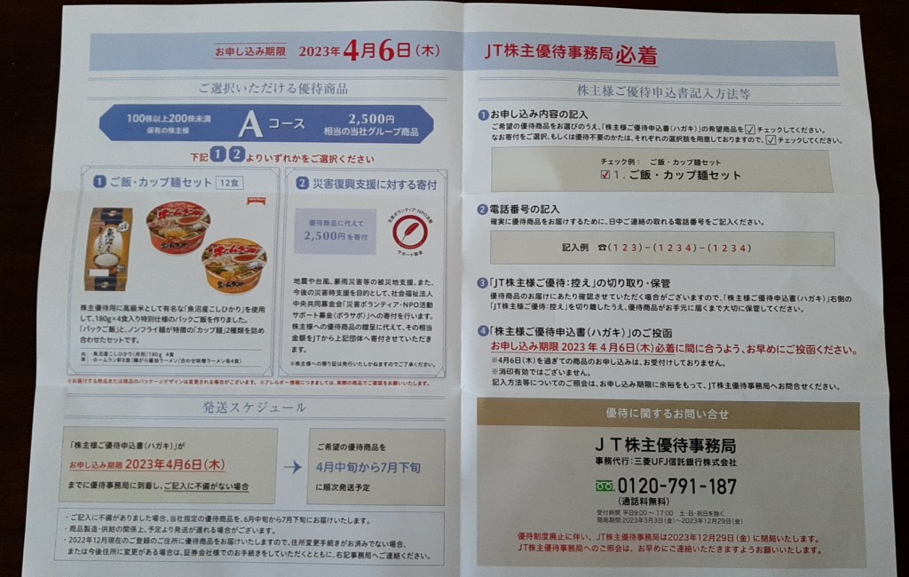 JT (日本たばこ産業) の「株主優待のご案内」という封書が届きました。