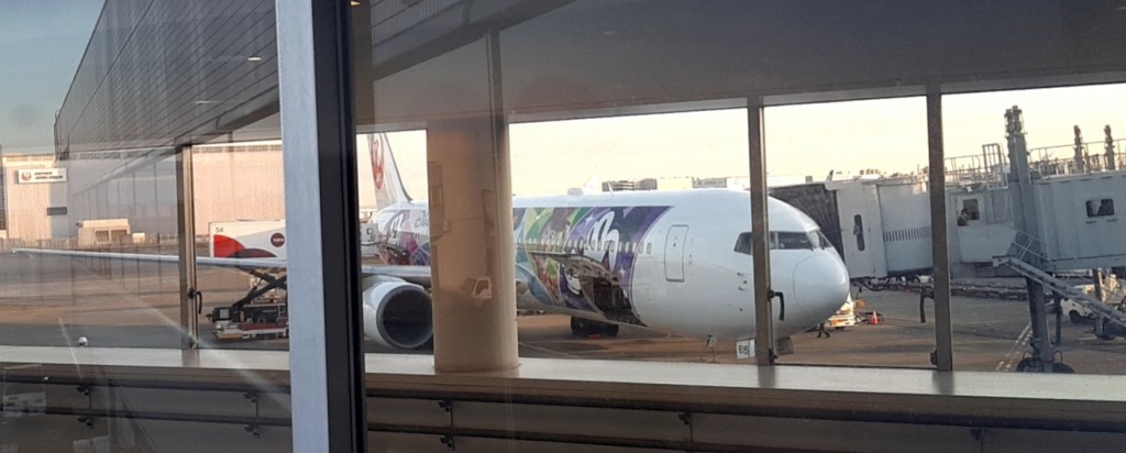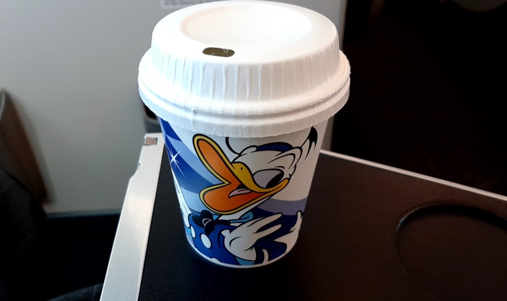 那覇→羽田はディズニーの絵でペイントされたB767機でした。座席のヘッドカバーもドリンクカップもディズニーキャラクターでした。