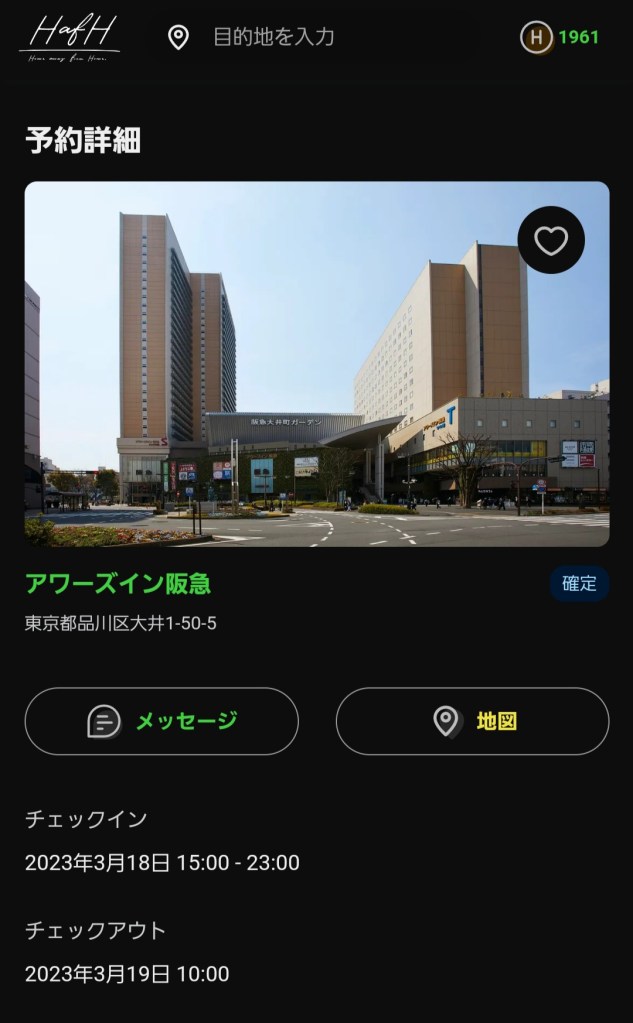 そこで宿泊施設のサブスクであるHafHを使います。JR大森駅前にある「アワーズイン阪急」です。