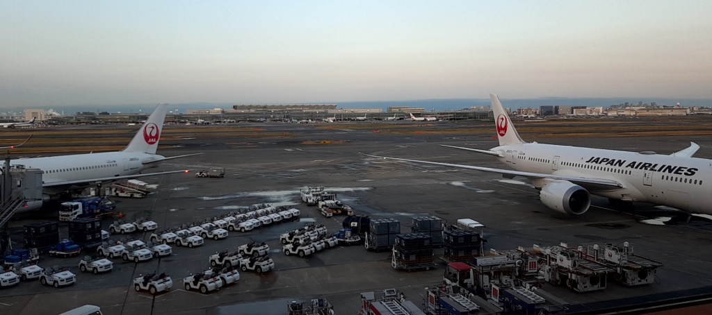 今朝は4時半に起きてJR大森駅4:59発の電車で品川駅まで行き、京急に乗り換えて羽田空港まで行きました。5時半には着いていました。