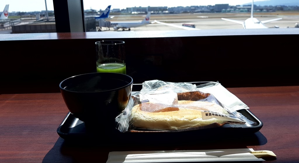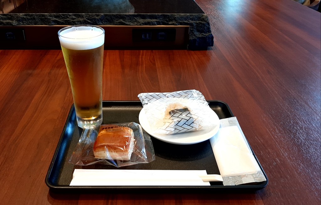 フライトは10~15分くらい遅れ気味で、食事はダイヤモンド・プレミアラウンジで短時間にビールとパンやおにぎりで済ませます。