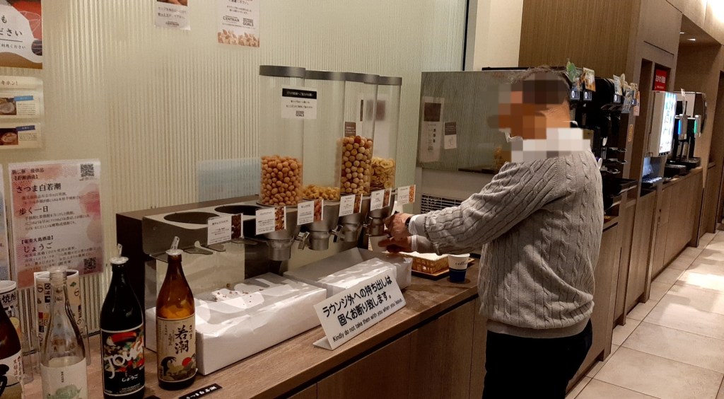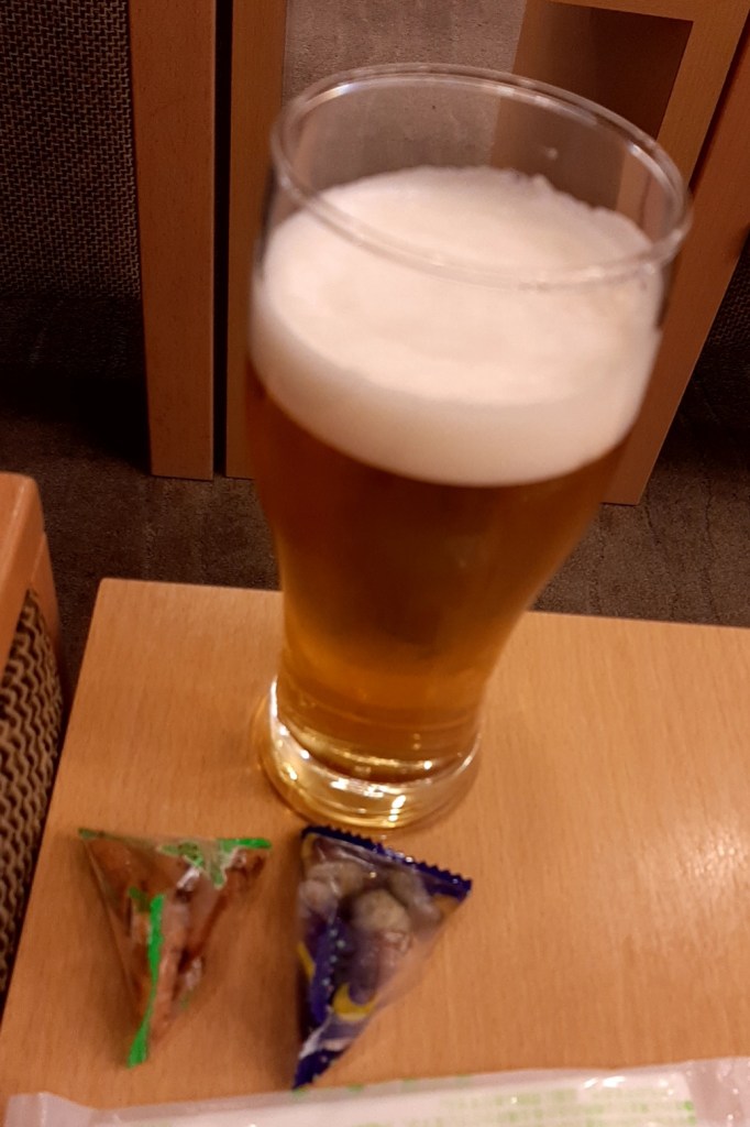 仕方がないので、Centrair Airline Loungeでプレミアムモルツと個包装のおつまみを頂きました。