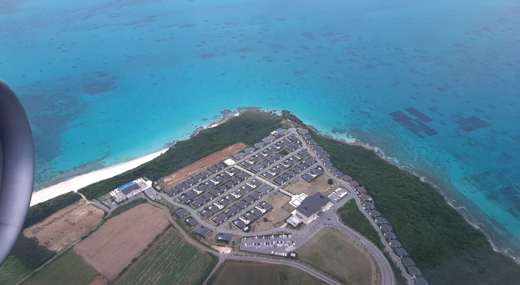宮古島上空は昨日に比べると少し雲が少ないような気がしました。海の色もグリーンだったりブルーだったり幻想的です。