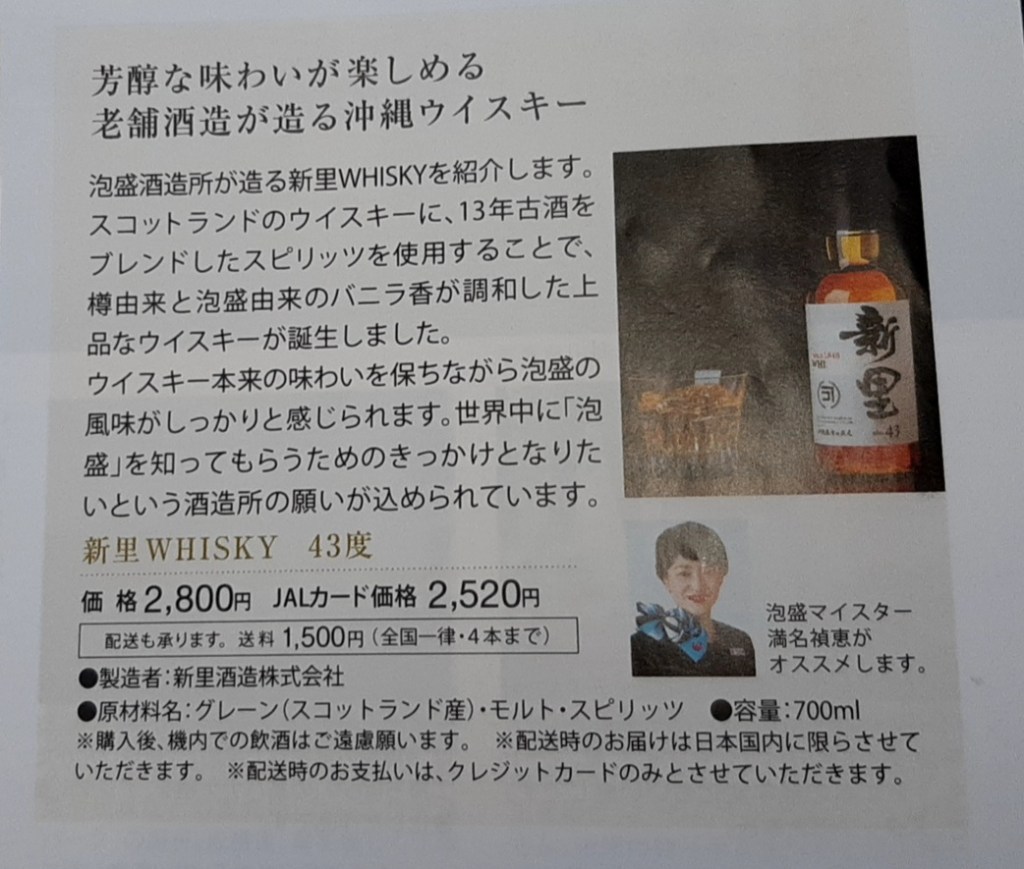 JTAの機内誌「Coralway」をめくっていると、先日ハイアットリージェンシー那覇沖縄のクラブラウンジで見た沖縄のオリジナルウイスキー「新里(しんざと)」が販売されていました。