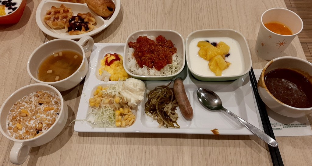 コンフォートホテル石垣島は無料朝食が付いています。ビジネスホテルの朝食はパンと飲み物くらいかなとあまり期待していませんでしたが、これが結構品数も豊富で、トラさんはすっかり気に入りました。
