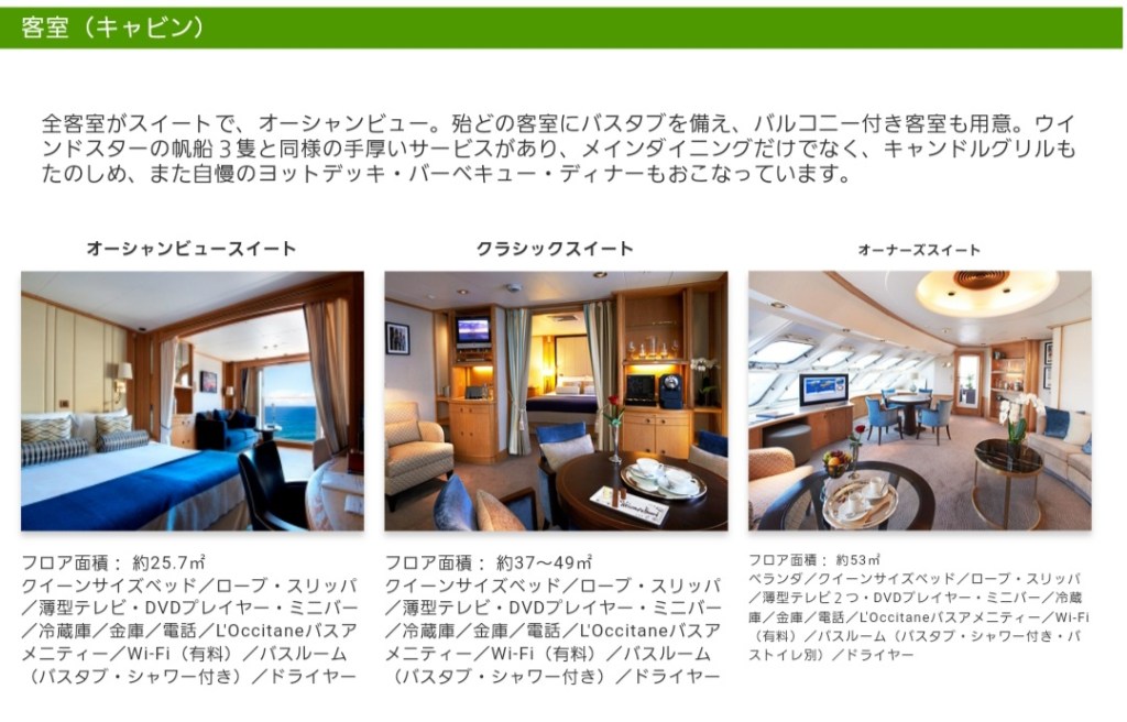 船が大きい割には旅客定員が少ないのは、全室オーシャンビュースイートだからのようです。