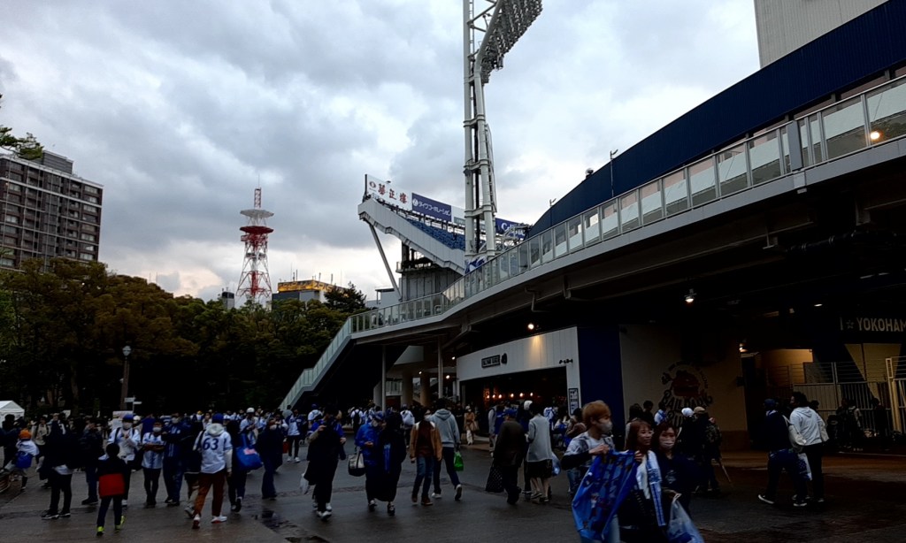関内駅は横浜スタジアム帰りのお客さんがたくさんいます。地上に出てからも青いユニフォーム姿の人が無茶苦茶いました。