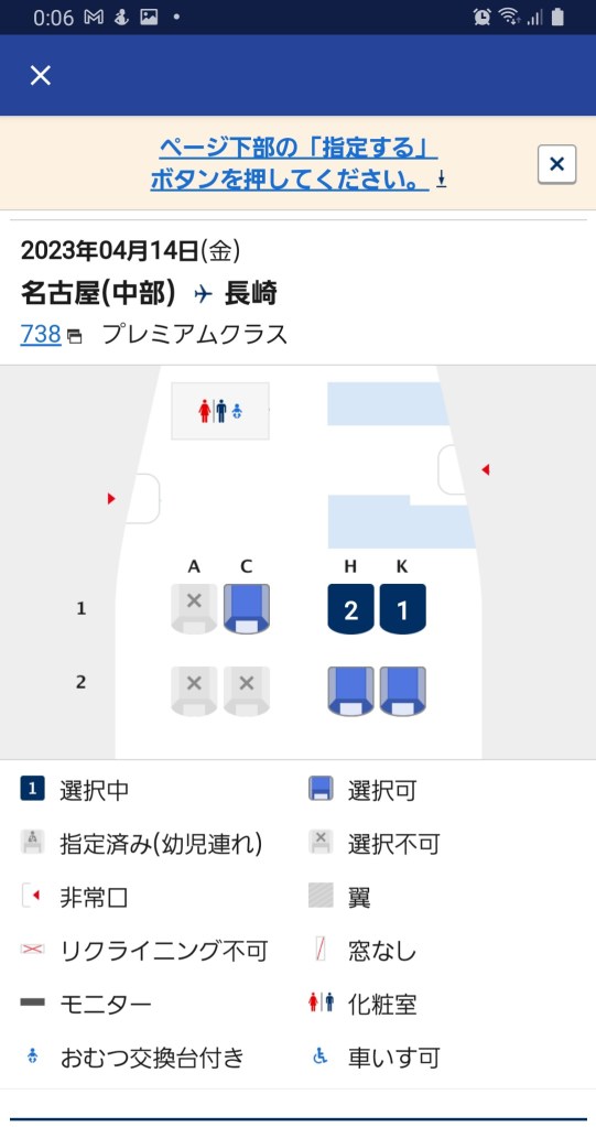 4月12日になったと同時に確認したところ、プレミアムシートに並びで空席があったのでUGPを一人4ポイントを使ってアップグレードさせました。