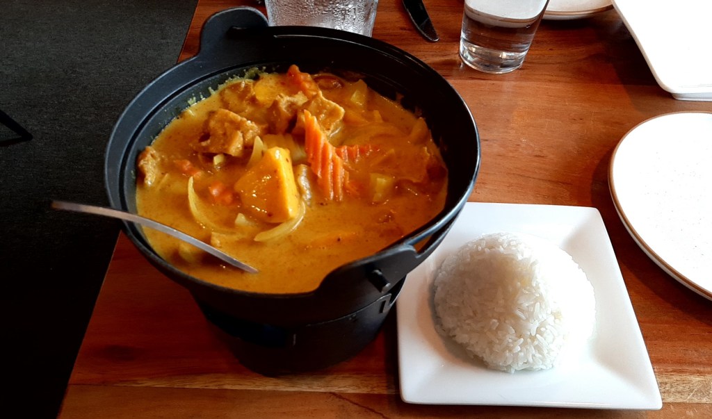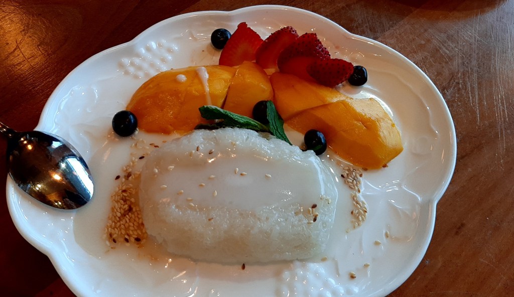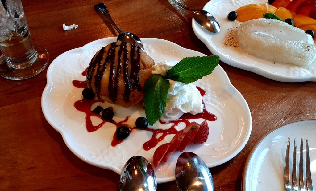 夕食は近くのタイレストランに行きました。トラさんはマンゴーカレーを頂き、デザートはシェアしました。