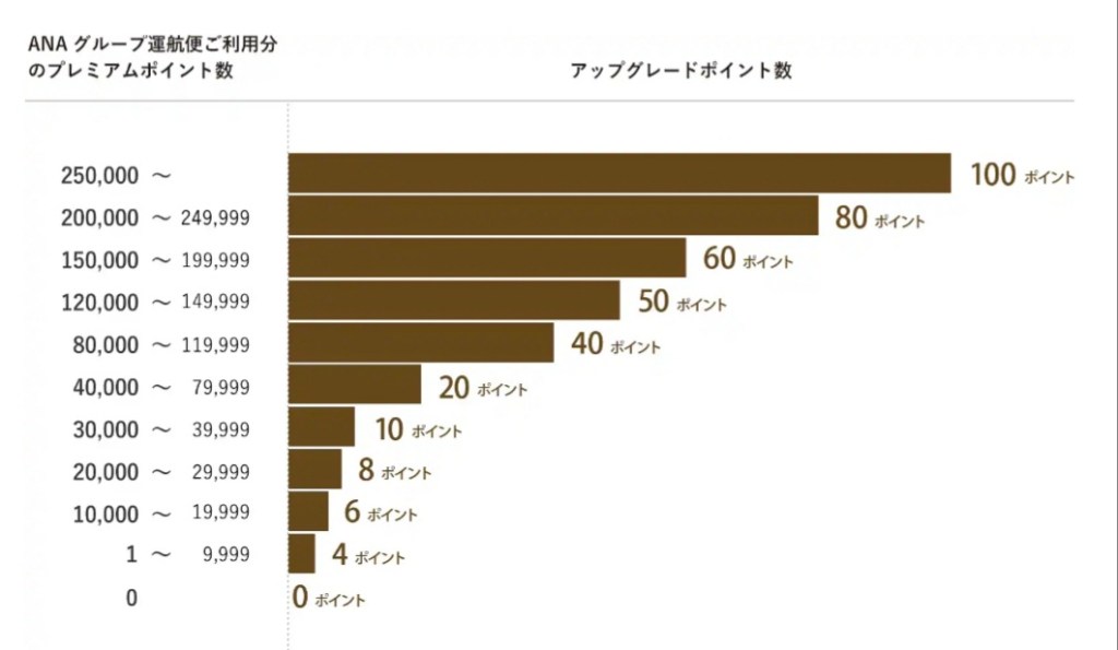 ANAの場合、1年間の獲得PPに応じて翌年度(4月~翌3月)に有効なアップグレードポイント(UGP)が付与されます。