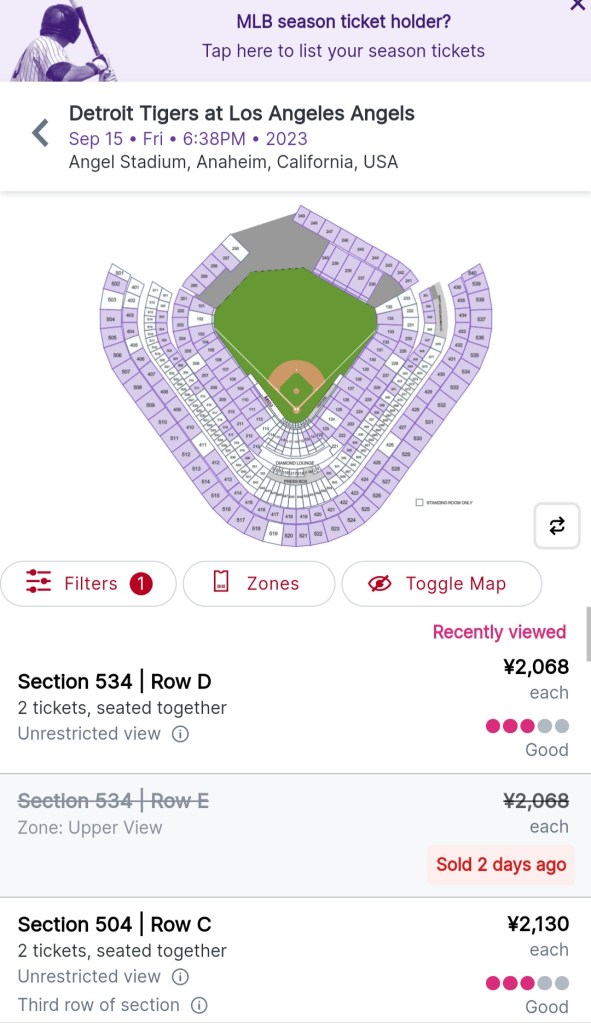大谷翔平選手のエンゼルス残留が確定したので、トラさんも9月に北米へ行く時にアナハイムにも寄って試合観戦をしたいと考えました。